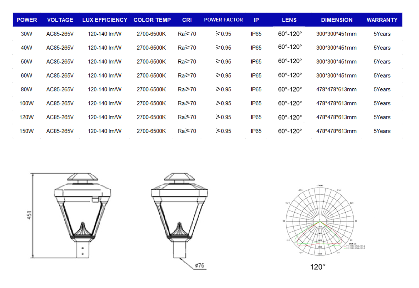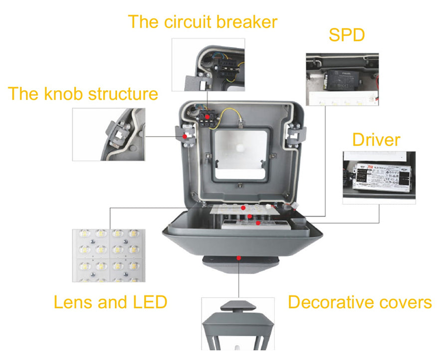 - ADC12 Die-casting Aluminum body of excellent heat-dissipation & anti-corrosion (height:4-8m)